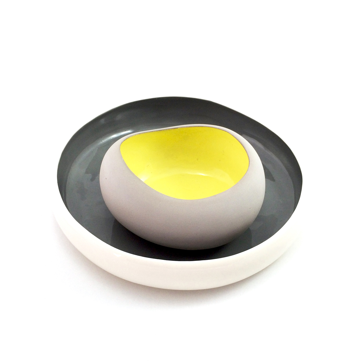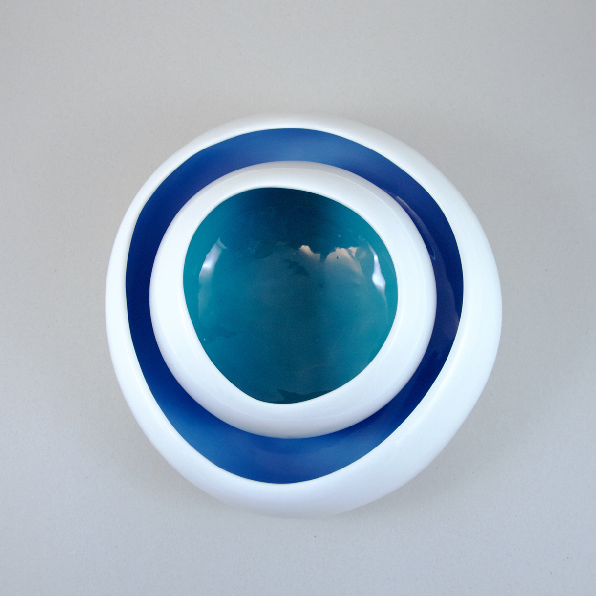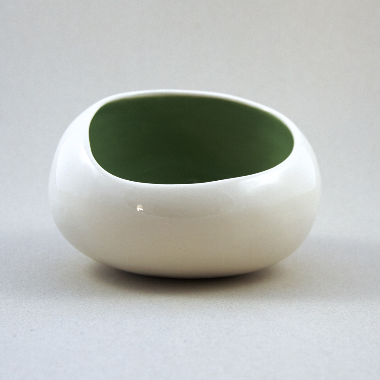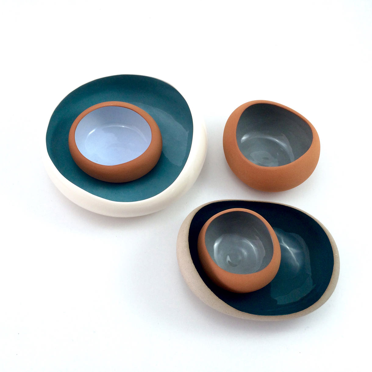 Myrto Zirini perceives clay and its transformation process into ceramics as a kind of creation of ‘cultural fossils’. A material body that carries – contemporary to the maker – information and shapes from one era to the following ones. When compared to most materials used for utilitarian objects clay has an amazing resilience to wear and time, despite its fragile nature. The organic/asymmetrical shaped vessels Myrto Zirini makes derive from the smoothing process of the rough stone into a pebble through the force of the wave. She thinks of each vessel as a unique chiseled pebble (or a section of) that internally has imprinted fleeting moments and colours of the greek coast.