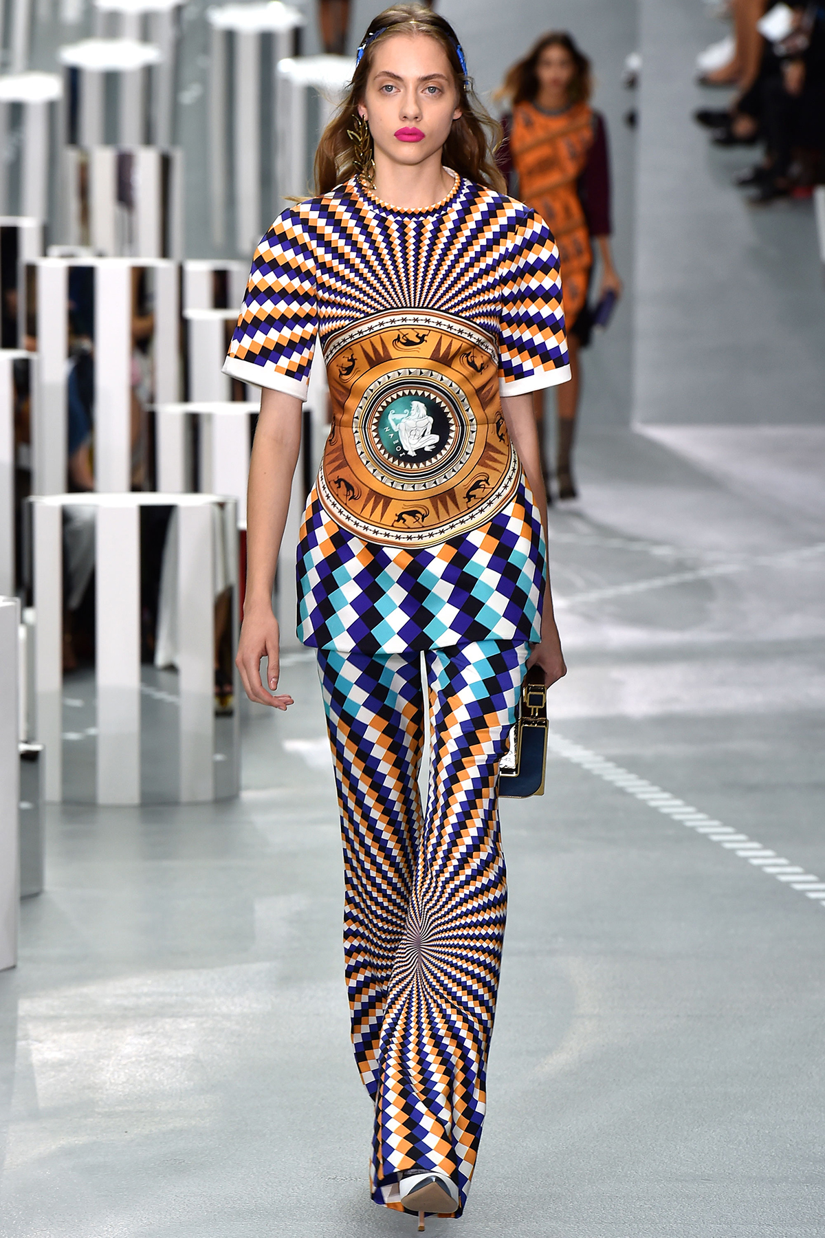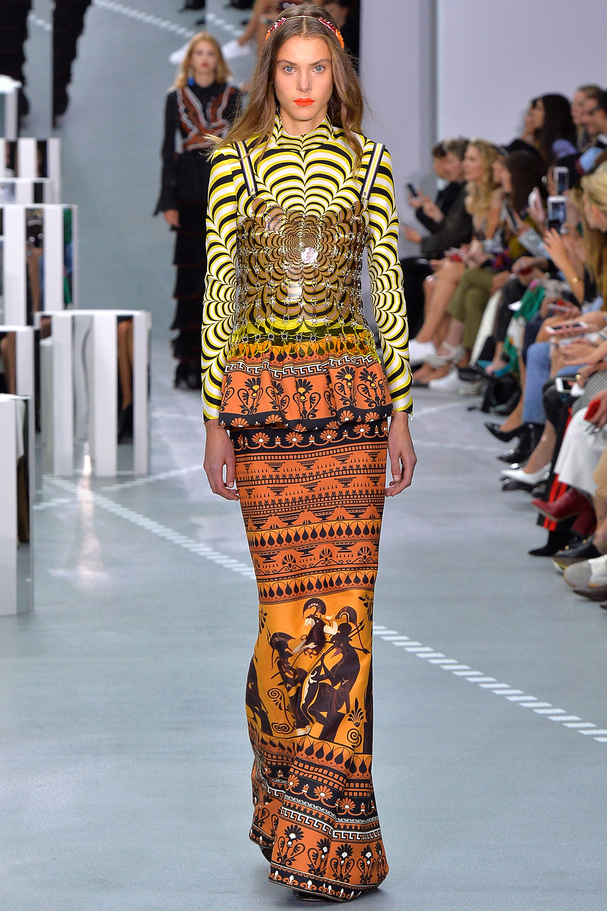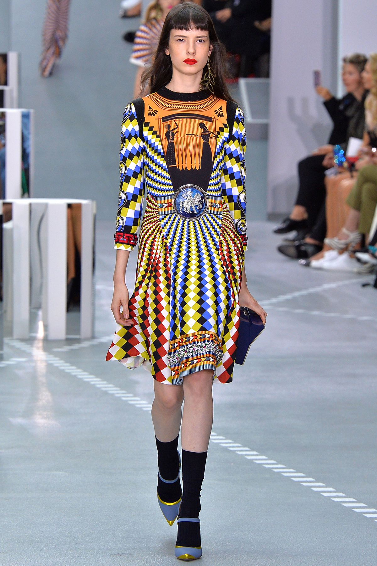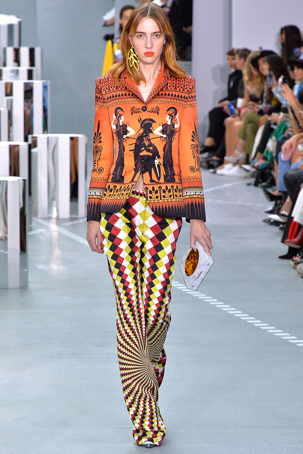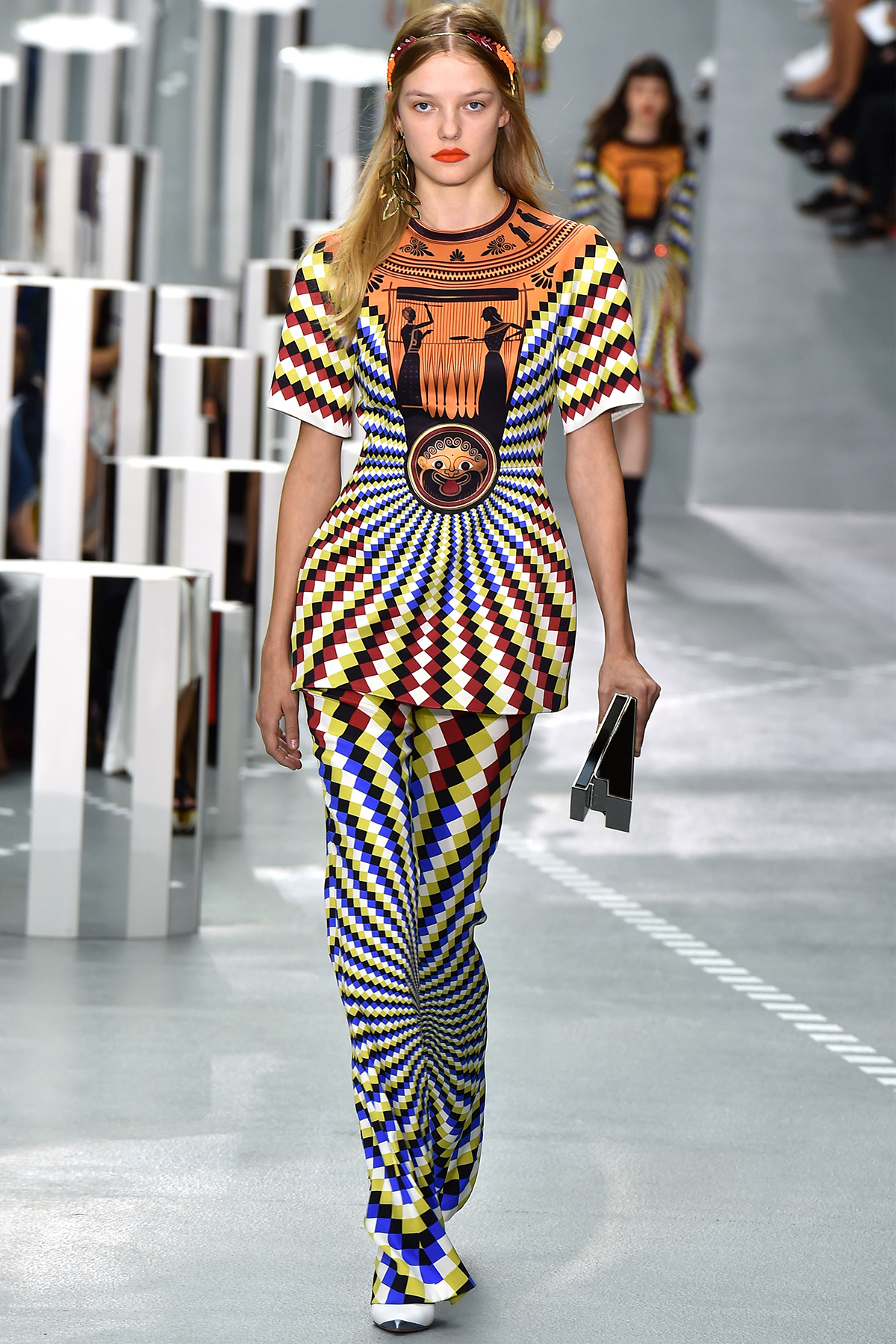 Mary Katrantzou combines the ancient with the hyper-modern, fusing classicism with futurism and sixties art. Ancient artefacts are warped through op-art designs, mapped across the topography of the body to create new focal points and emphasis.