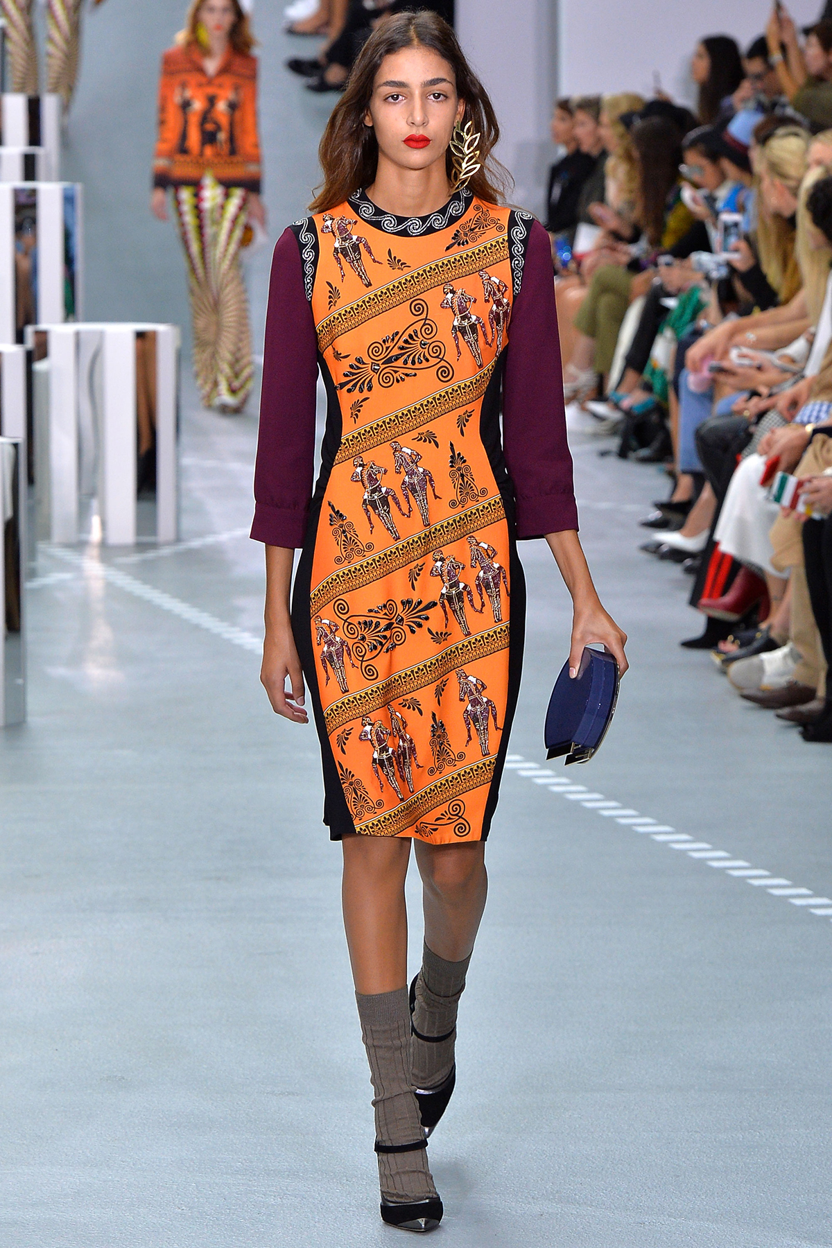 The New Classical collection marks a return to her trademark of trompe l’oeil prints, technically superlative across hourglass-seamed dresses and slender trousers with tunics. Curvaceous Amphora vases, streamlined and made modern.